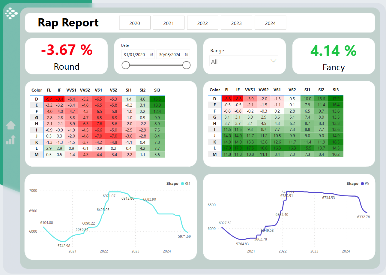Interactive Diamond Rapaport Dashboard offering pricing insights, market trends, and comparative analysis for informed trading and valuation.